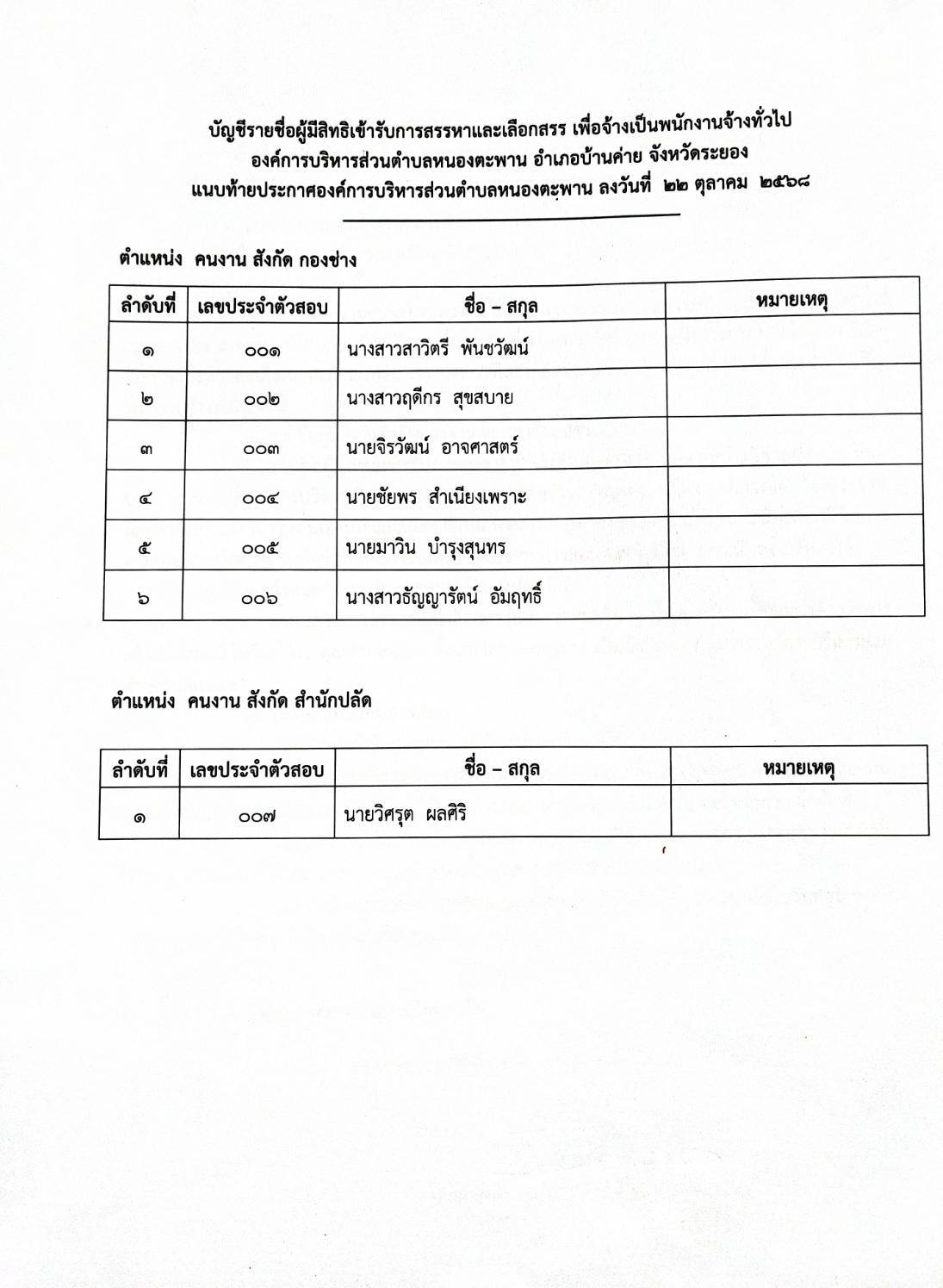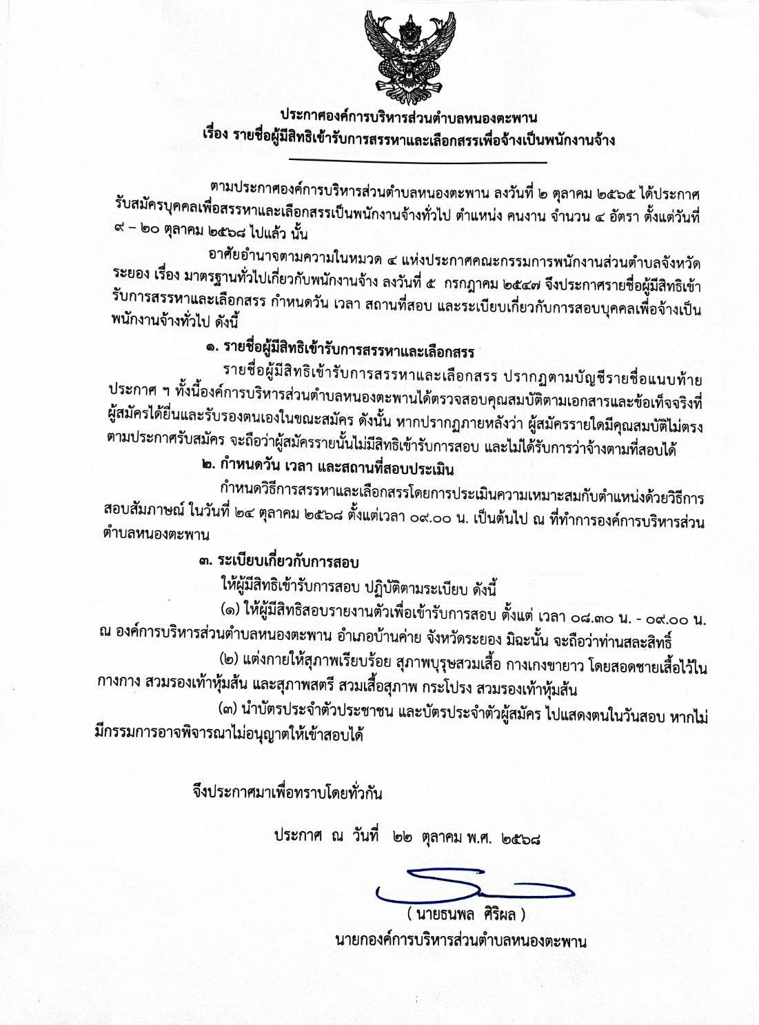ประกาศรายชื่อผู้มีสิทธิ์เข้ารับการสรรหาและเลือกสรรเพื่อจ้างเป็นพนักงานจ้าง