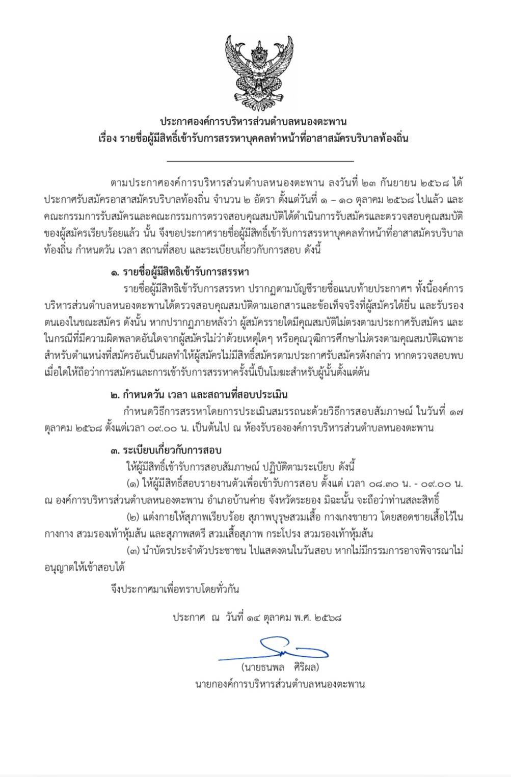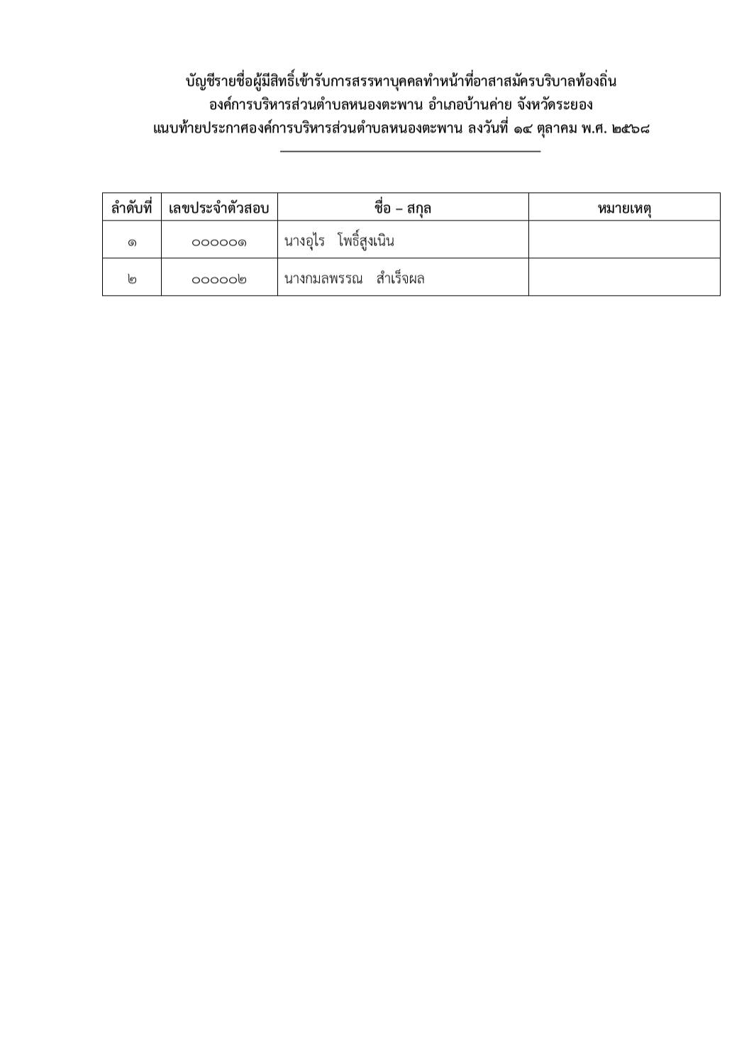 ประกาศ รายชื่อผู้มีสิทธิ์เข้ารับการสรรหาบุคคลทำหน้าที่อาสาสมัครบริบาลท้องถิ่น