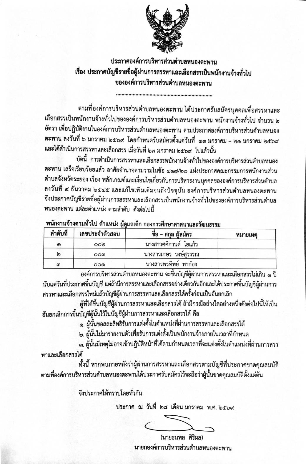ประการรายชื่อผู้ผ่านการสรรหาและเลือกสรรเพื่อจ้างเป็นพนักงานจ้าง
