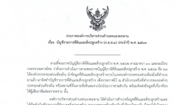 ประกาศองค์การบริหารส่วนตำบลหนองตะพาน เรื่อง บัญชีรายการที่ดินและสิ่งปลูกสร้าง(ภ.ด.ส.3)ประจำปี พ.ศ.2569