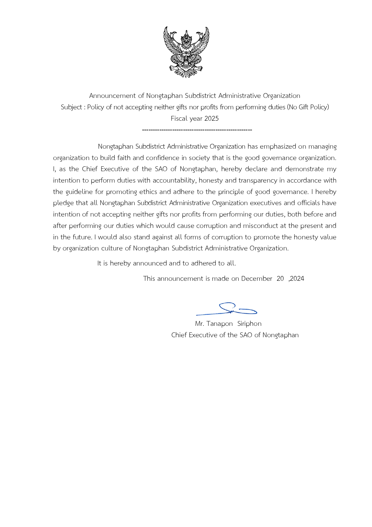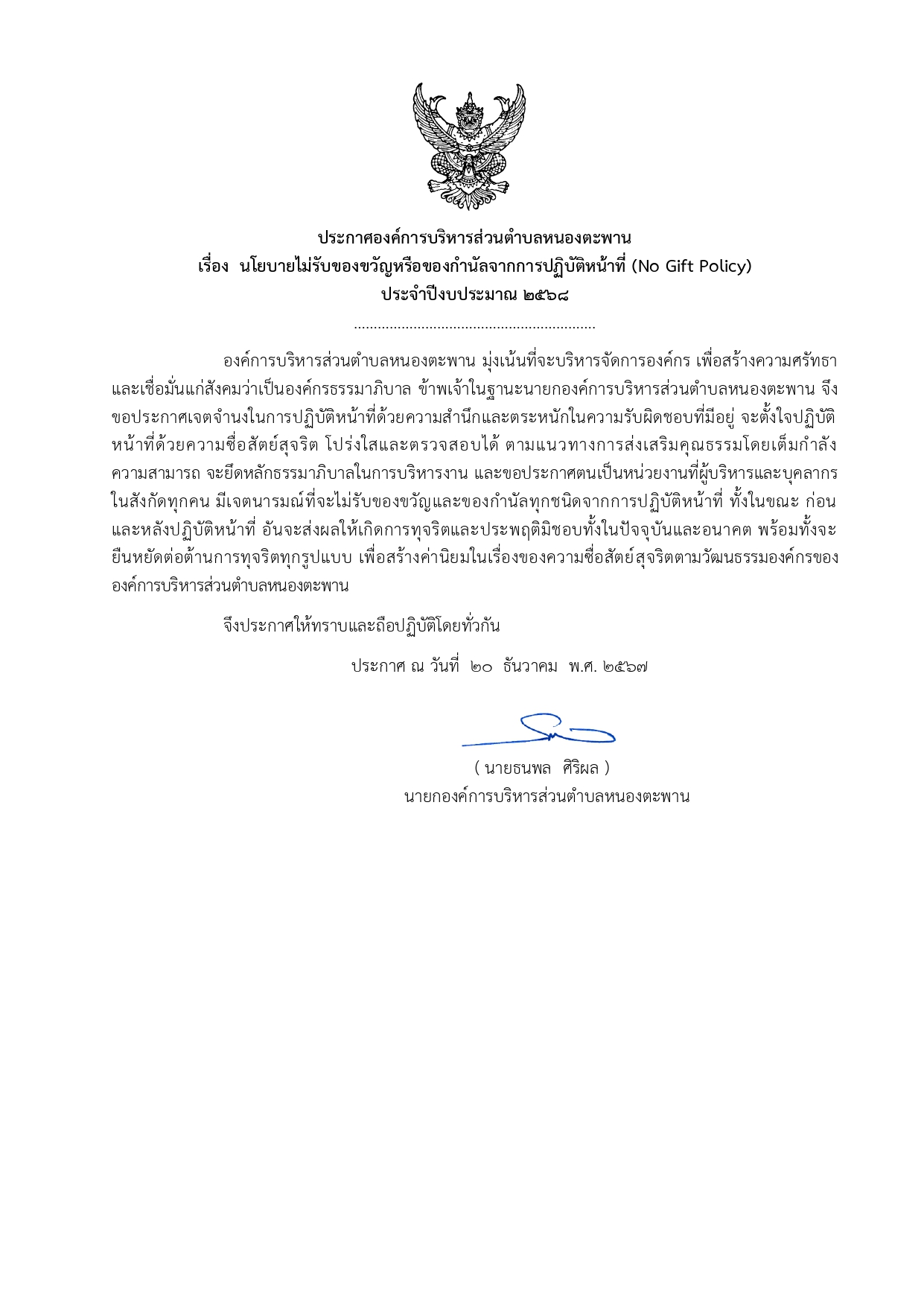 ประกาศ อบต.หนองตะพาน เรื่องนโยบายไม่รับของขวัญหรือของกำนัลจากการปฏิบัติหน้าที่ (No Gift Policy) ประจำปีงบประมาณ 2568 20 ธ.ค. 2567 139 ครั้ง ◀️ หน้า / ▶️ เอกสารแนบ คลิกเพื่อดาวน์โหลดประกาศ อบต.หนองตะพาน เรื่องนโยบายไม่รับของขวัญหรือของกำนัลจากการปฏิบัติหน้าที่ (No Gift Policy) ประจำปีงบประมาณ 2568